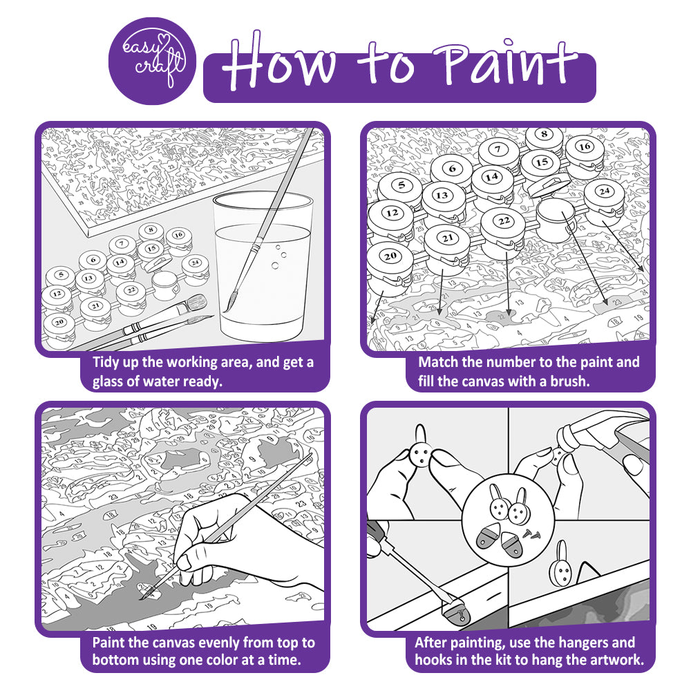 Inside this complete kit, you’ll find everything needed to begin your artistic journey: a premium pre-printed textured framed canvas, three professional-grade paintbrushes in assorted sizes, a full set of acrylic paints, two triangle ring hangers, two three-pin hooks for effortless mounting, an A4 black-and-white instruction sheet, an A3 painting guide, an A4 colour reference sheet, and a beautifully designed package.